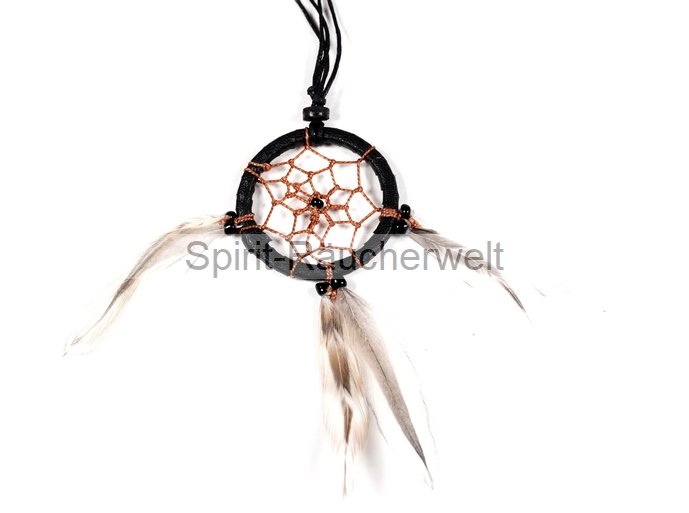 Der kleine Traumfänger-Anhänger ist mit lederähnlichem Material umwickelt und mit Perlen und Federn verziert.