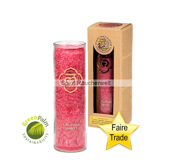 1. Chakra Kerze rot im Glas mit naturreinen äth. Ölen - faire Trade und GreenPalm zeritfiziert