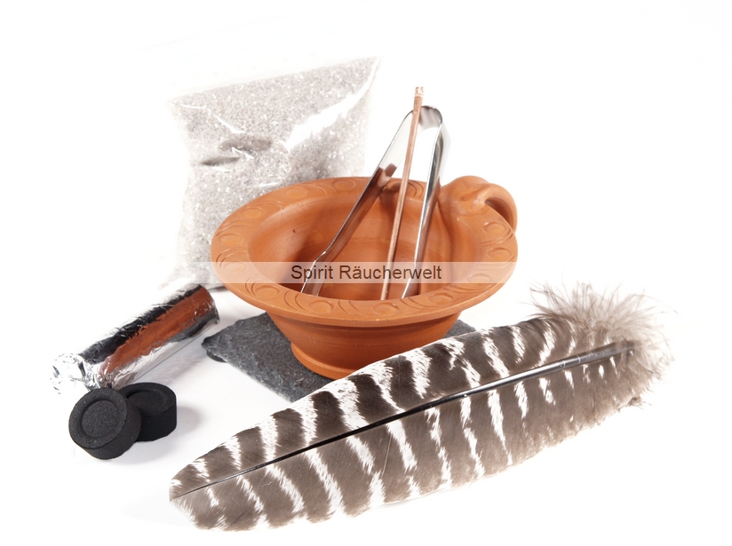 Die praktische Räucherschale hat einen Henkel. Sie kann mühelos im Raum herumgetragen werden, was z.B. beim energetischen Ausräuchern von Vorteil ist. Räuchersand, Räucherkohle, Räucherlöffel und Zange machen das Set komplett. Einen Untersetzer für die Schale und eine Truthahn-Räucherfeder enthält es ebenfalls, sowie eine ausführliche Räucheranleitung.