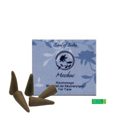 Diese Räucherkegel werden nach der traditionellen MASALA Methode unter fairen Bedingungen in Indien hergestellt. Dabei werden die natürlichen Aromastoffe in den Grundstoff eingeknetet.