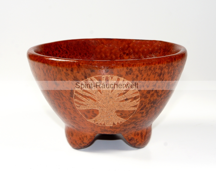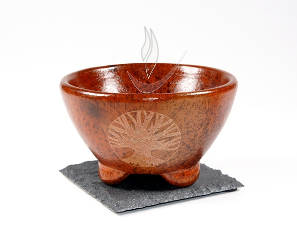 Stabile Räucherschale aus braunem, glasiertem Ton mit eingraviertem Symbol Baum des Lebens. Die Schale steht auf 3 kleinen Füßchen. Dadurch wird einer allzu großen Hitzeentwicklung am Schalenboden entgegengewirkt. Es empfiehlt sich trotzdem, die Schale auf einen Untersetzer zu stellen.