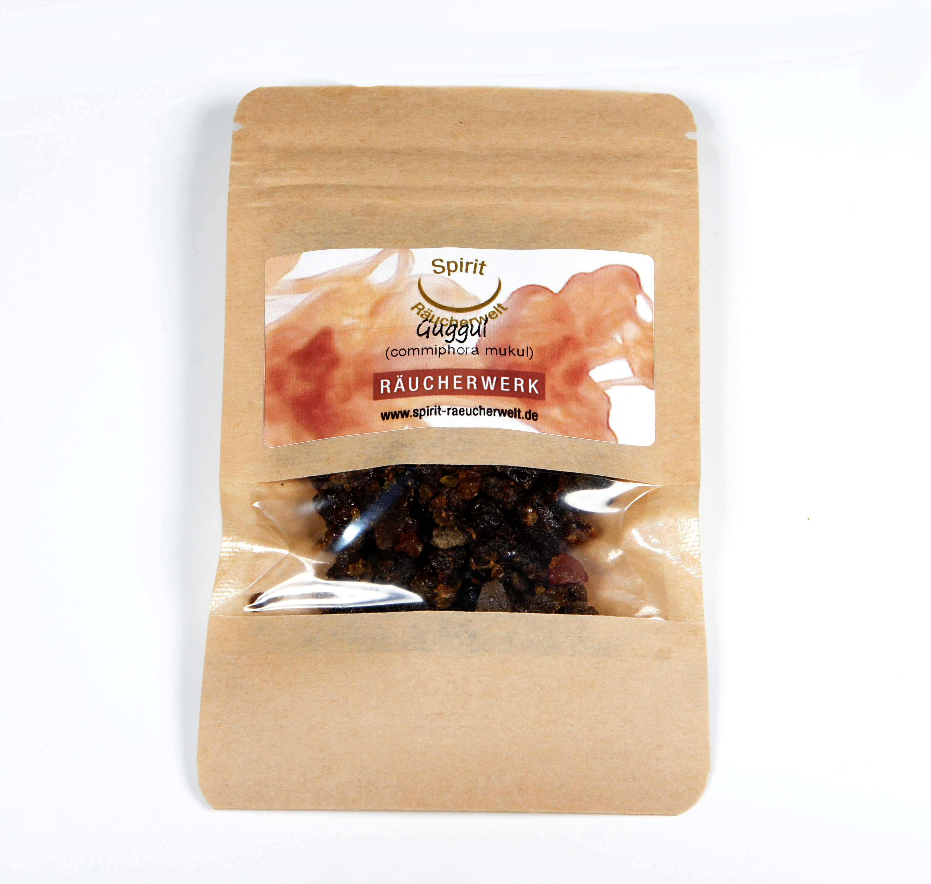 Guggul auch Bdellium genannt, zählt zu den  ayurvedischen Heilmitteln. Das gelblich-braune Harz wirk allgemein ausgleichend und harmonisierend. Es stärkt die Nerven und wirkt Stressbelastung entgegen. Guggul duftet fein balsamisch-waldig mit einer frischen Note. Der feine Guggulduft kommt besonders gut zur Geltung, wenn das Harz auf dem Räucherstövchen verräuchert wird.
