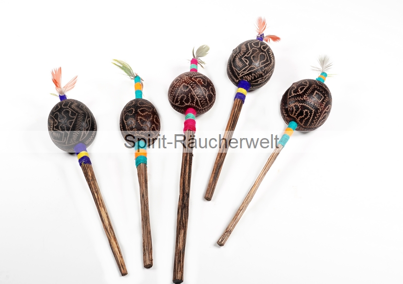 Jede Rassel ist somit ein Unikat und auch in der Größe und Form etwas unterschiedlich. Sie werden in reiner Handarbeit mit figürlichen und grafischen (indianischen Motiven) Schnitzereien liebevoll verziert, oberhalb und unterhalb des Rasselkopfes mit bunten Wollfäden verschlossen. Das obere Ende bilden bunte Vogelfedern.
