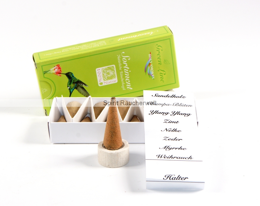 Mit dem praktischen Green Line Räucherkegel Sortiment kannst du acht verschiedene naturreine Düfte - Sandelholz, Champa Blüten, Ylang Ylang, Zimt, Nelke, Zeder, Myrrhe und Weihrauch ausprobieren.