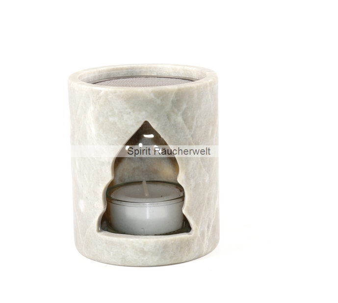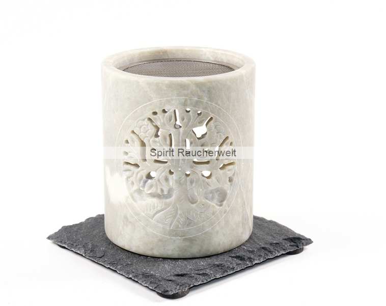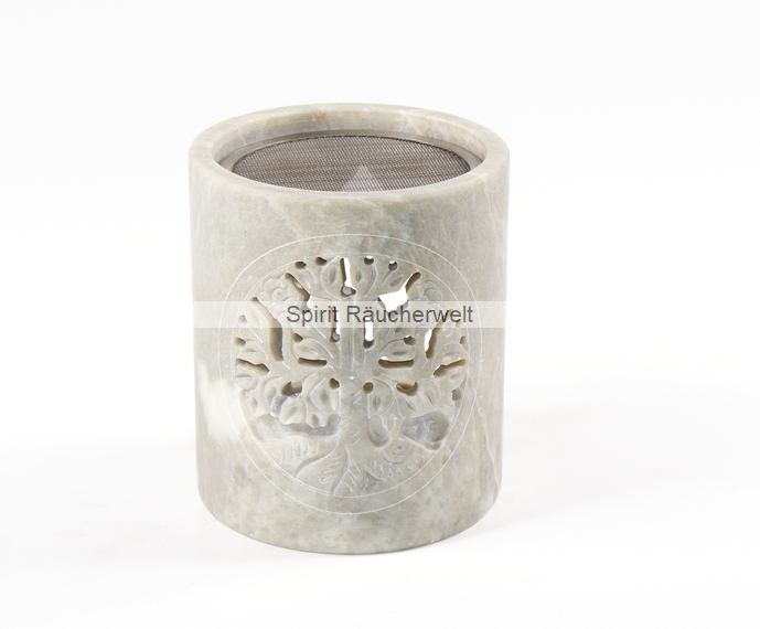Sie erhalten hier ein kleines, zylindrisches Räucherstövchen aus Speckstein mit Edelstahlsieb in grau-bräunlich-rötlichen Farbtönen. Auf der Vorderseite ist es mit einem schön gearbeiteten Baum des Lebens Symbol verziert.