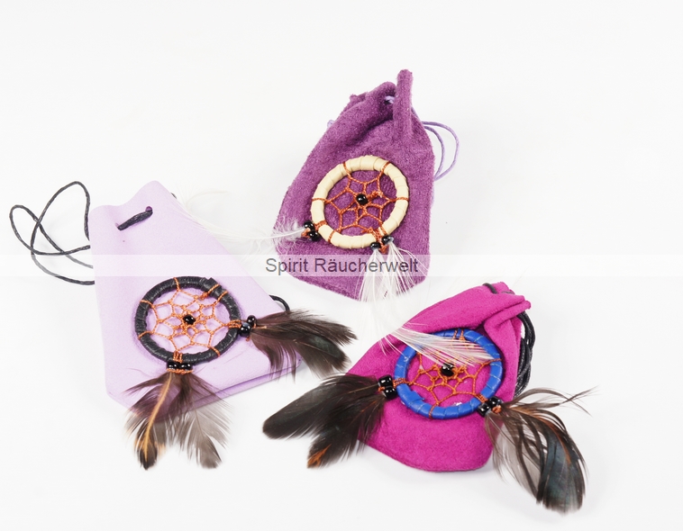 Kleines pinkfarbendes Beutelchen zum Aufbewahren von diversen schamanischen Utensilien, Kräutern oder Räucherwerk. Der Beutel ist aus weichem wildlederähnlichem Material gefertigt. Auf der Vorderseite ist er mit einem handgearbeiteten Traumfänger, Perlen und Federn verziert. Er hat eine lange Zugkordel und kann auch als Brustbeutel getragen werden.