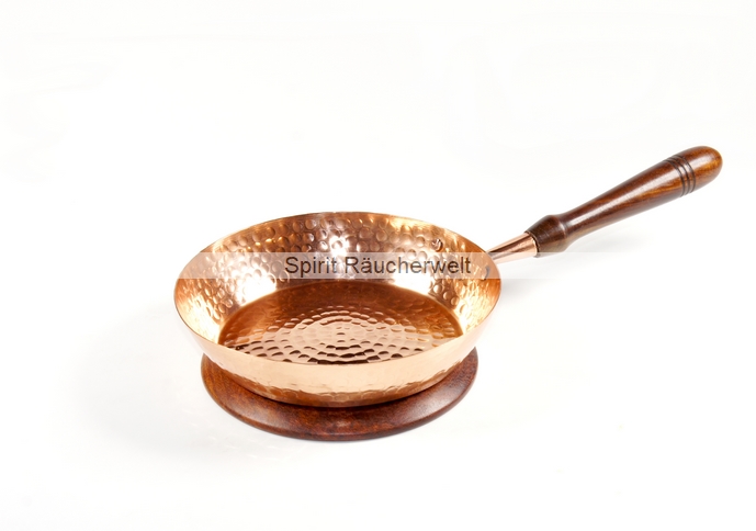 Praktische Räucherpfanne aus Kupfer mit Holzgriff - bestens geeignet zum Haus ausräuchern. Der Vorteil dieser Räucherpfanne liegt in ihrem geringen Gewicht von ca. 150g und dem langen Holzgriff. Dies macht das Hantieren sehr komfortabel. Die Pfanne ist ohne Deckel und somit auch zum Räuchern mit einer Kräutermischung gut geeignet. Da beim Räuchern mit Kräuter die verglimmten Reste schnell wieder von der Kohle geschoben werden müssen, wäre ein Deckel sehr hinderlich, da dieser ständig auf und zu gemacht werden müsste. Deshalb ist eine Pfanne ohne Deckel zum Verräuchern von Kräutern sinnvoller. Auch Weihrauch oder andere Harze lassen sich in dieser Pfanne problemlos verräuchern.
