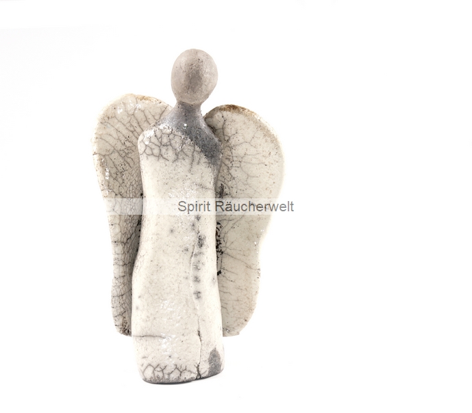 Dieser Engel (Einzelstück) ist liebevoll von Hand getöpfert und anschließend in einem speziellen, sehr aufwändigen Brennverfahren bei offenem Feuer mit Sägemehl gebrannt. Der im reduzierten zeitlosen Design angefertigte Engel ist weiß glasiert. Bei diesem Brand entstehen die charakteristischen Risse in der Glasur, die diese Technik so reizvoll und einzigarig macht. Der besondere Raku-Brand macht diesen Engel zu einem exklusiven, einzigartigen Stück, welches sich von der Massenware abhebt.