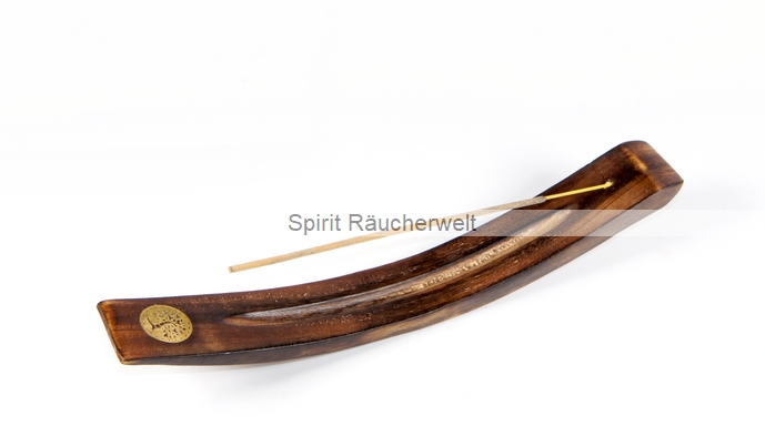Sie erhalten hier einen Räucherstäbchenhalter aus Mangoholz in Gondelform. Das Baum des Lebens Symbol ist als Messing-Intarsie gearbeitet. Das goldfarbene Symbol kommt auf dem dunklen Holz gut zur Geltung.