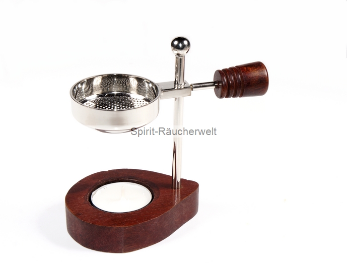 modernes, edles Weihrauchstövchen zum Räuchern mit einem Teelicht. Es besteht aus einem Holzsockel in den das Teelicht gestellt wird und einer Messing-Weihrauchschale mit herausnehmbarem Sieb. Die Weihrauchschale kann individuell in der Höhe eingestellt auf der gewünschten Höhe fest arretiert werden.