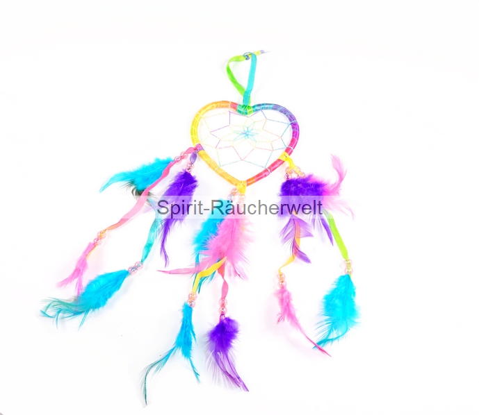 Der Traumfänger besteht aus einem mit bunten Bändern umwickelten herzförmigem Reif und einem bunten Traumfängernetz. Die drei Federnschnüre sind mit bunten Perlen und federn geschmückt.