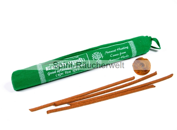 Diese nepalesischen Räucherstäbchen sind ohne Holzstäbchen hergestellt. Sie sind im Durchmesser dicker als Räucherstäbchen aus Indien, deshalb steckt man sie traditionell in ein kleines mit Sand gefülltes Räucherschälchen oder benutzt den in jeder Packung enthalten kleinen Holzständer.