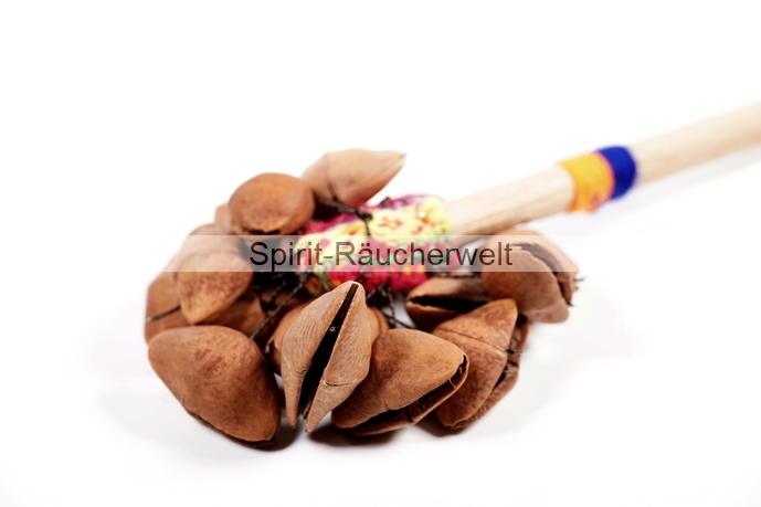 Diese Rassel besteht aus aufgesprungenen Samenschalen, die an einem Holzstiel befestigt sind. Wenn man sie schüttelt, erzeugen die Schalen einen schönen, satten Klang. Hergestellt wird sie von peruanischen Ureinwohnern. Gemäß dieser Tradition ist die Rassel mit bunten Fäden geschmückt. Diese Rassel ist ein handliches, sehr ursprüngliches schamanisches Handwerkszeug. Je nachdem wie sie geschüttelt wird, erzeugt sie Töne verschiedener Lautstärke. Das Klangspektrum reicht von leise und sanft bis hin zu kräftigen vollen Tönen. Deshalb kann sie sowohl für schamanische Reisen wo eher sanfte Klänge gewünscht sind als auch für Reinigungs- und Heilungszeremonien wo eher kräftiger Klänge benötigt werden, eingesetzt werden. Ich finde, sie ist ein wirklich rundes schamanisches Werkzeug, mit dem es richtig Freude macht zu arbeiten.