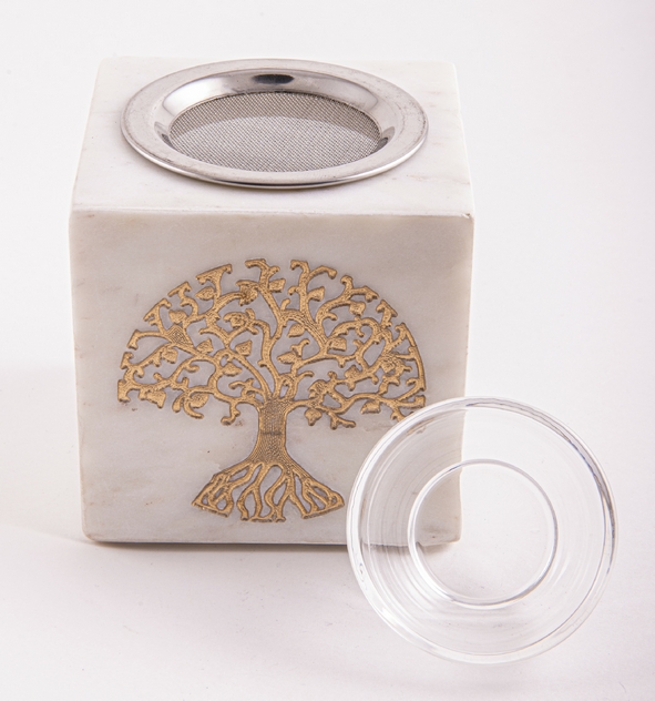 Sie erhalten hier ein praktisches, trendiges, schweres Kombi-Räucherstövchen aus weißem Marmor mit Edelstahlsieb und Glasschale. Auf der Vorderseite ist es mit einem schön gearbeiteten goldfarbenen Baum des Lebens Symbol verziert. Da es sich um ein Kombistövchen handelt, können Sie auf dem Sieb räuchern und in der Glasschale ätherische Öle verdampfen.