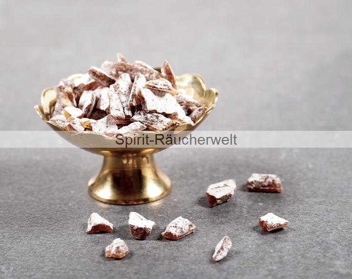 Auch auf Räucherkohle läßt sich Rosenweihrauch klassisch verräuchern. Hier nur kleine Portionen auflegen und die angeglimmten Harzrückstände mit der Räucherzange wieder von der Kohle entfernen um unangenehmen Brandgeruch zu vermeiden. Bei Bedarf anschließend wieder eine kleine Portion Aromaweihrauch auflegen.