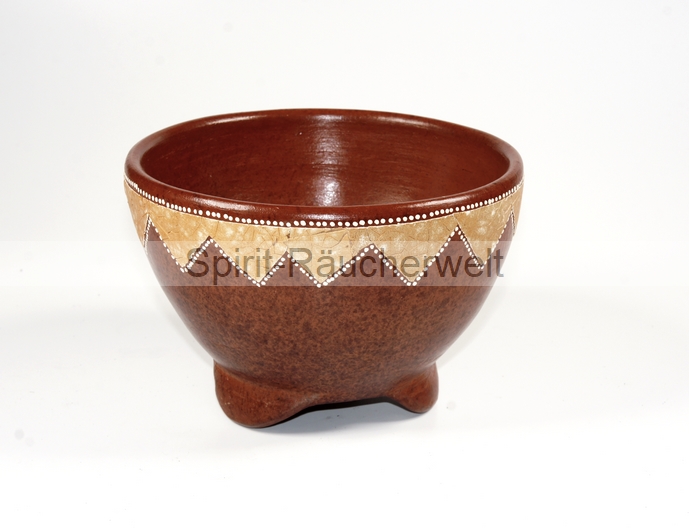 sehr schöne, aufwändig in harmonischen Naturtönen gestaltete Räucherschale, mit hellbeigen, weiß abgesetzten dreieckigen Ziereinlagen am äußeren Rand. Die Schale steht auf 3 Füßchen.