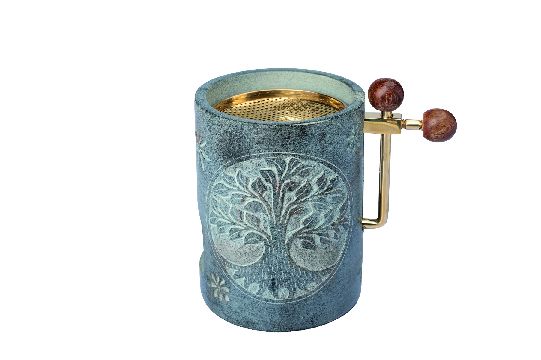 Das Stövchen ist aus grauem Speckstein und mit feinen Gravuren und dem Motiv Baum des Lebens verziert.
