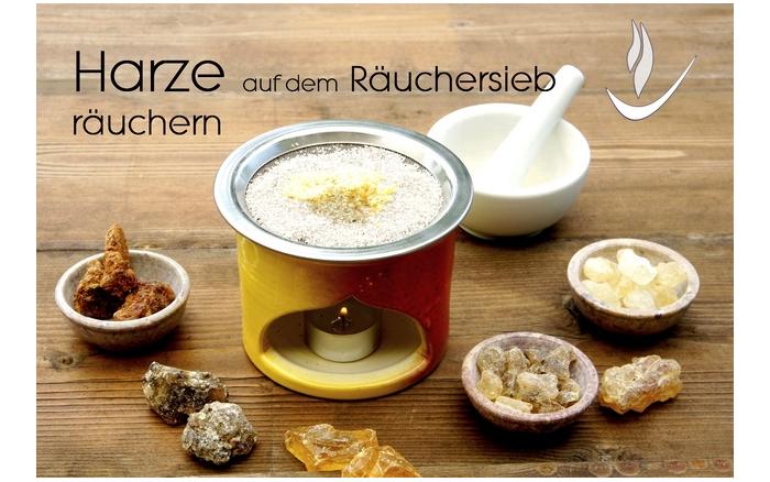 Nicht jedes Harz lässt sich auf dem Sieb mit einem Teelicht verräuchern. Oft hilft es, wenn Sie das Harz mörsern. Sollte die Hitze des Teelichtes nicht ausreichen, dann lässt sich das Harz nur mit der Räucherkohle verräuchern oder in einem speziellen Weihrauchbrenner. Aber die Kohle nicht auf das Sieb legen - es würde irgendwann durchglühen - sondern in eine mit Sand gefüllte Räucherschale oder auf ein speziell für Kohle geeignetes Gitternetzgefäß.
