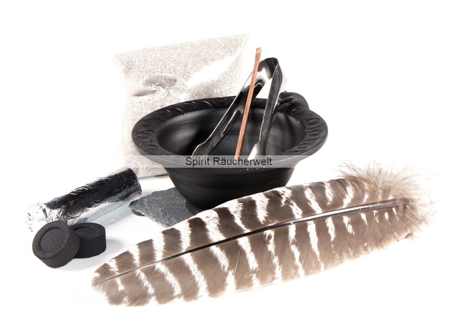 Die praktische Räucherschale hat einen Henkel. Sie kann mühelos im Raum herumgetragen werden, was z.B. beim energetischen Ausräuchern von Vorteil ist. Räuchersand, Räucherkohle, Räucherlöffel und Zange machen das Set komplett. Einen Untersetzer für die Schale und eine Truthahn-Räucherfeder enthält es ebenfalls, sowie eine ausführliche Räucheranleitung.